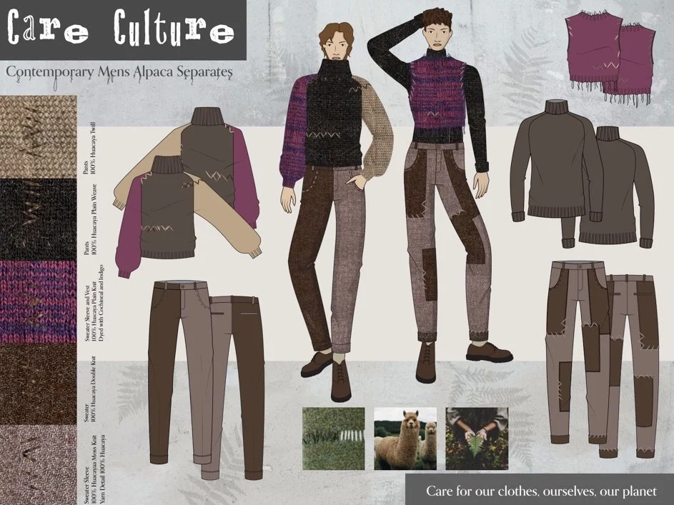 “Who and what do we value? This question sits at the heart of Care Culture, as people reprioritize wellbeing over work, investment over fast fashion, and the planet over profit. I was inspired by cozy streetwear and a consumer that cared deeply for their planet, their clothing, and themselves. Layered separates allow for the playful combination of multiple textures and silhouettes to maximize the pieces in our wardrobe. Yarn stitches and patches embrace a mending aesthetic, as we learn to care for our clothing and its longevity. Utilizing the color natural palette of alpaca with natural dyes to supplement allows the fibers to retain their sustainable qualities such as being biodegradable and eco-friendly. Alpaca fibers are also naturally hypoallergenic and non-irritating to the skin unlike sheep wool. Care culture places the responsibility in our own hands as we continue to learn the best ways for us to care for our clothing, ourselves, and our earth.”